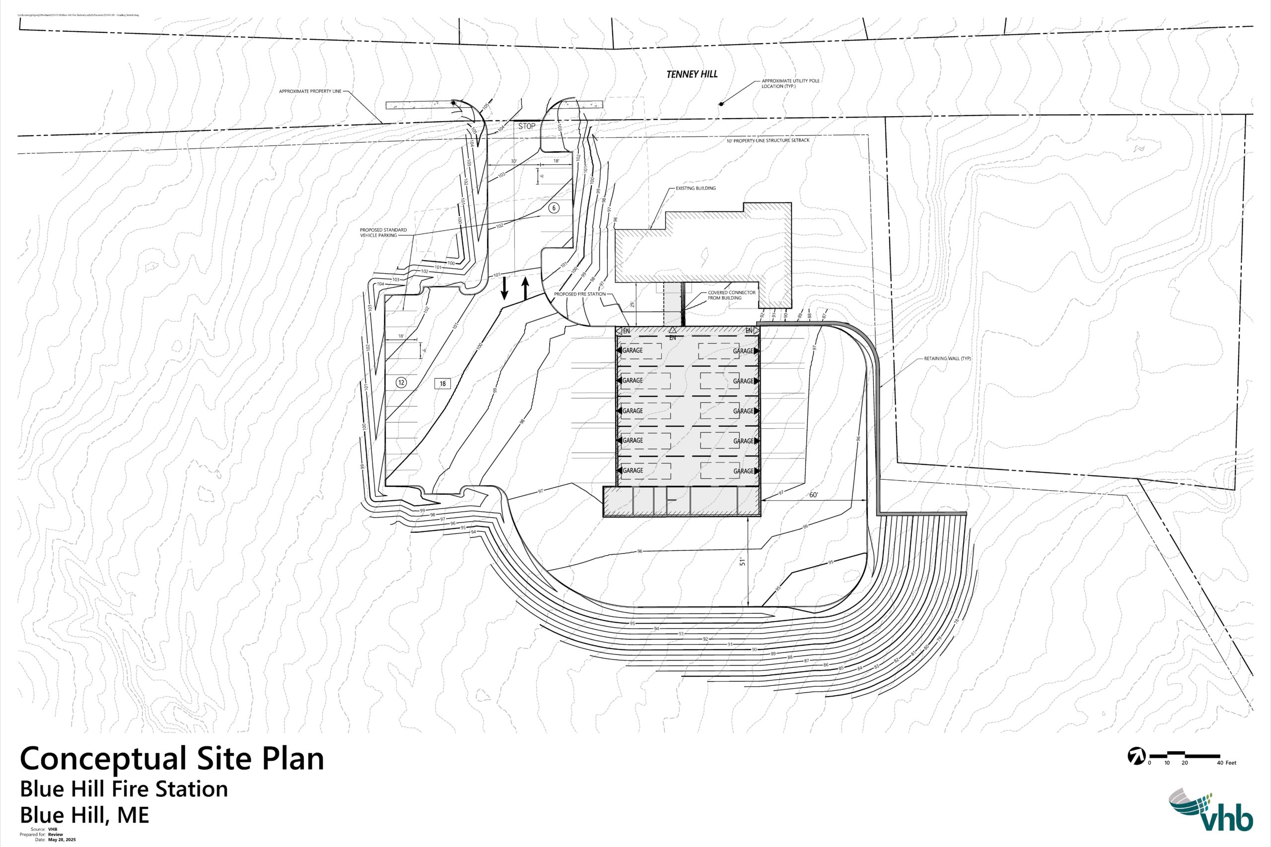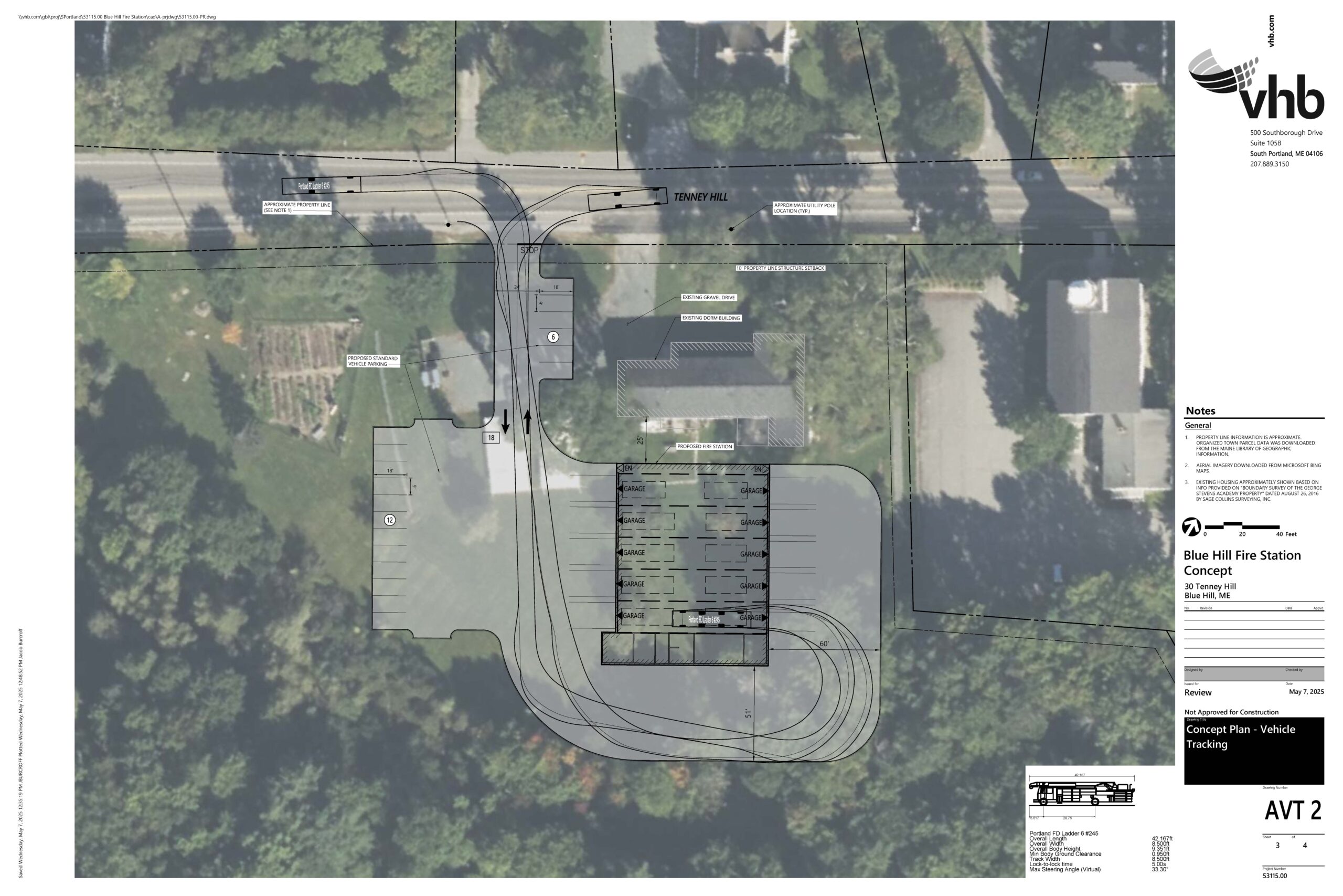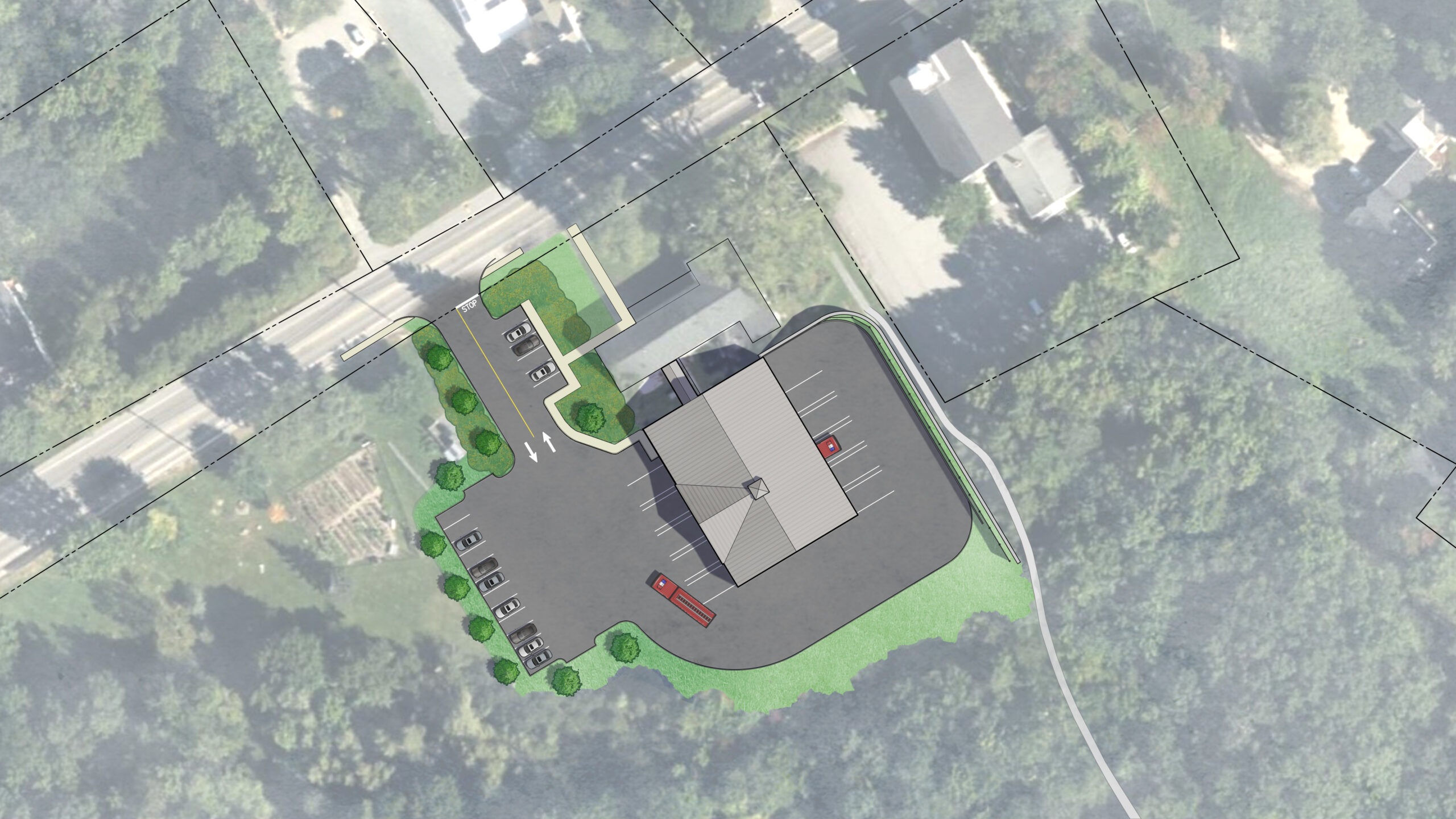 The conceptual design of the public safety building–including both the existing dorm building and a newly constructed apparatus bay–is shown below. This particular graphic was produced in connection with the engineers’ evaluation of the turning areas required for fire trucks.