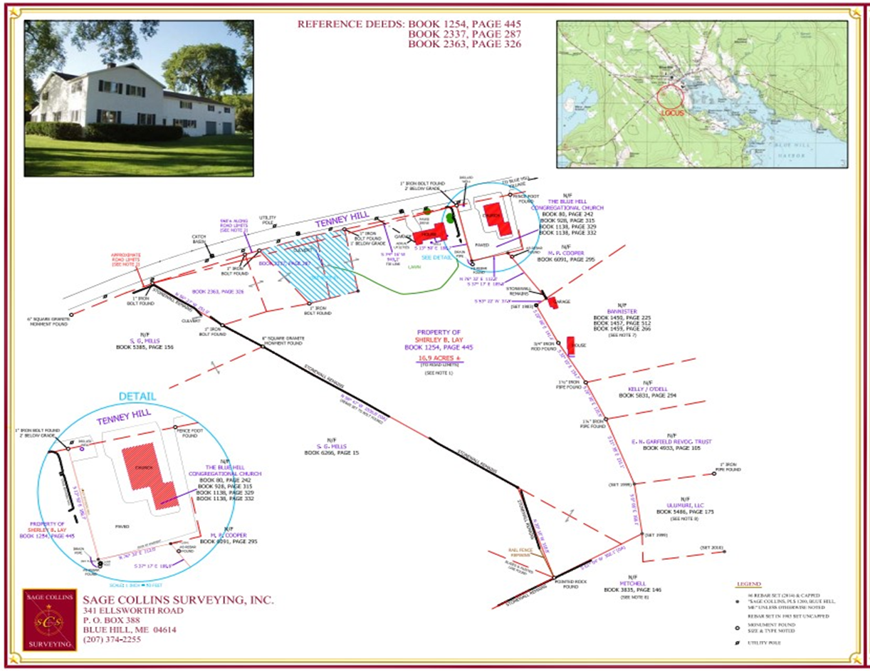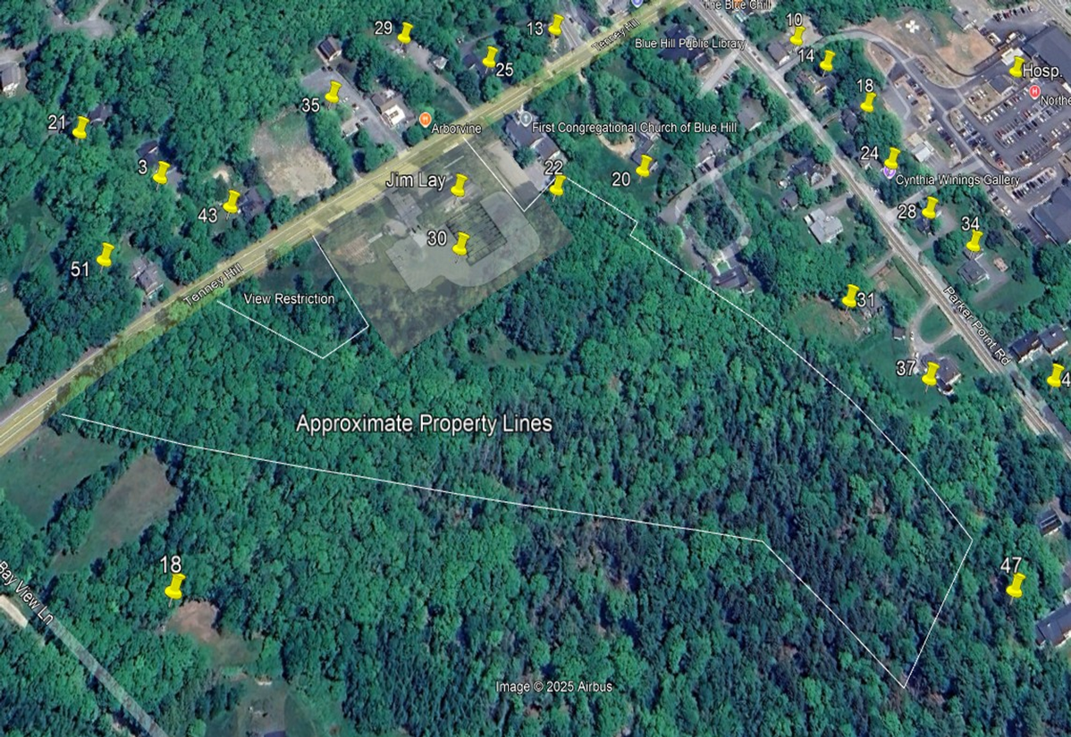 The satellite photo overlay shows the extent of the parcel and its proximity to the residences on Parker Point Road. This image also includes a shadowed portion showing the expanded building footprint and the current community garden area.